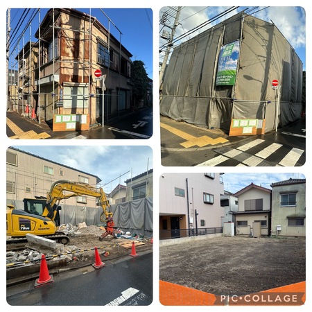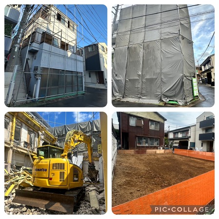 このように狭い物件は3.2階部分を手壊しで解体撤去をしていきます。そして1階から重機搬入し機械撤去をして安全第一に丁寧にたたんでまいりました。